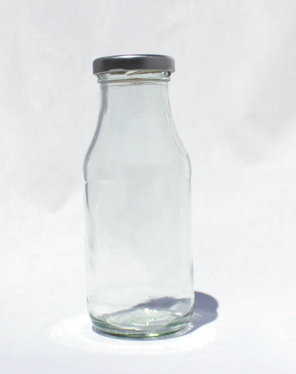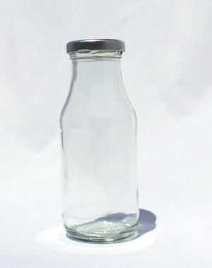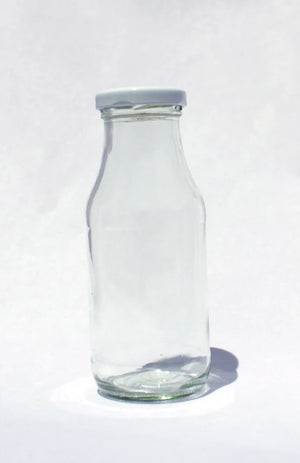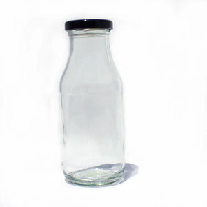 Pequeña botella de vidrio para leche, yogur o jugo con tapa de metal tipo Twist off tamaño 43 (diámetro en mm).